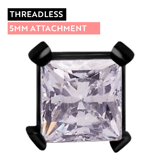 Elevate your piercing with this sleek and modern 5mm square zirconia piece, crafted from premium black titanium for exceptional durability and a stylish, contemporary look. The threadless attachment ensures a secure fit while allowing for easy, comfortable wear.