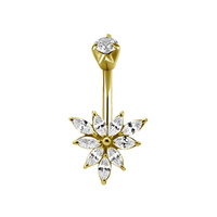 This vintage inspired belly bar is made from real 24K Gold PVD coated SS316L Surgical Steel. It features a stunning Marquise cluster arrangement of oval-shaped cubic zirconia. The highest quality materials have been used to craft this dazzling piece and guarantee high skin tolerability and longevity. Make this your everyday piece or an eye-catcher at your next special occasion.
