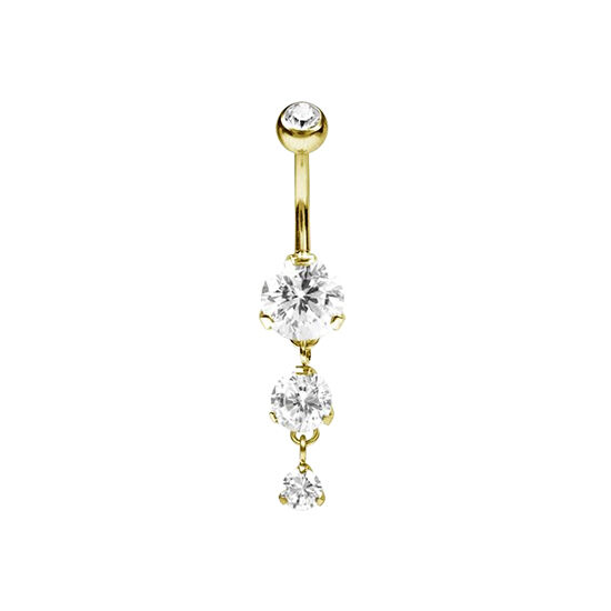 This beautiful double-jewelled belly bar is made from real 24K Gold PVD coated SS316L Surgical Steel. It features three stunning 'round set' cubic zirconia which create an impressive sparkle. The highest quality materials have been used to craft this unique piece and guarantee high skin tolerability and longevity. A dainty, elegant piece for any occasion or everyday wear.