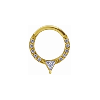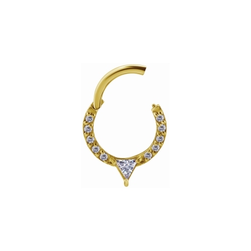 This beautiful hinged ring is made from 24K Gold PVD coated SS316L Surgical Steel. The highest quality materials have been used to craft this beautiful piece and guarantee high skin tolerability and won’t tarnish or wear off. It features front facing premium zirconia gemstones and a triangle centerpiece ideal for a septum piercing and a variety of cartilage piercings. Designed for everyday wear or for a special occasion.